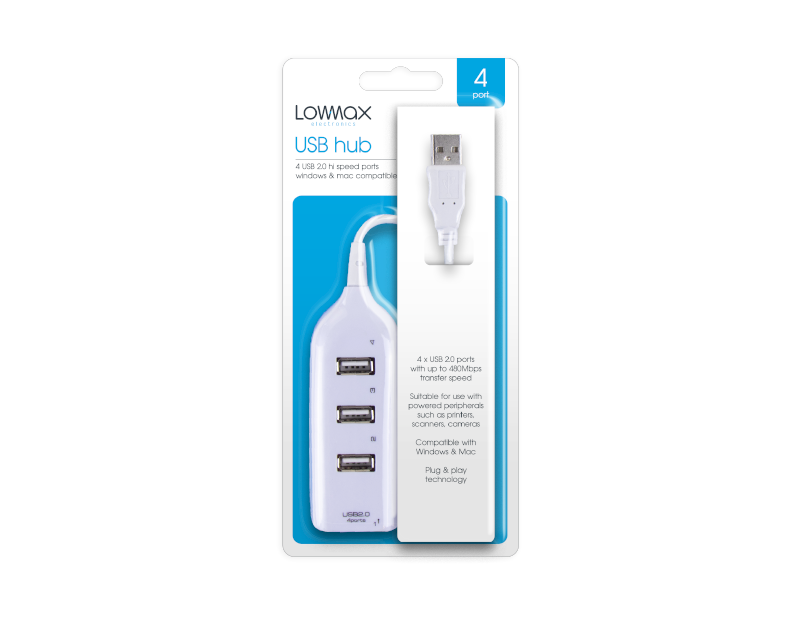 This handy 4 in 1 USB Hub can be simply plugged into an existing USB socket to offer an additional four 2.0 USB ports that have a data transfer speed of up to 480Mbps.
